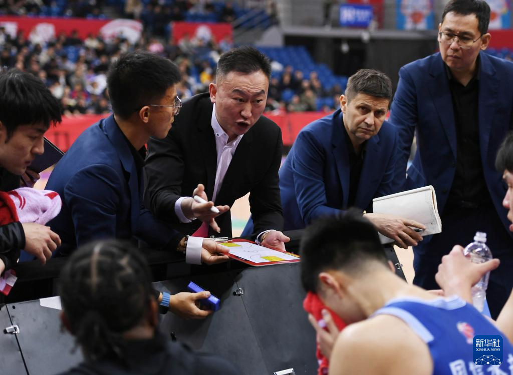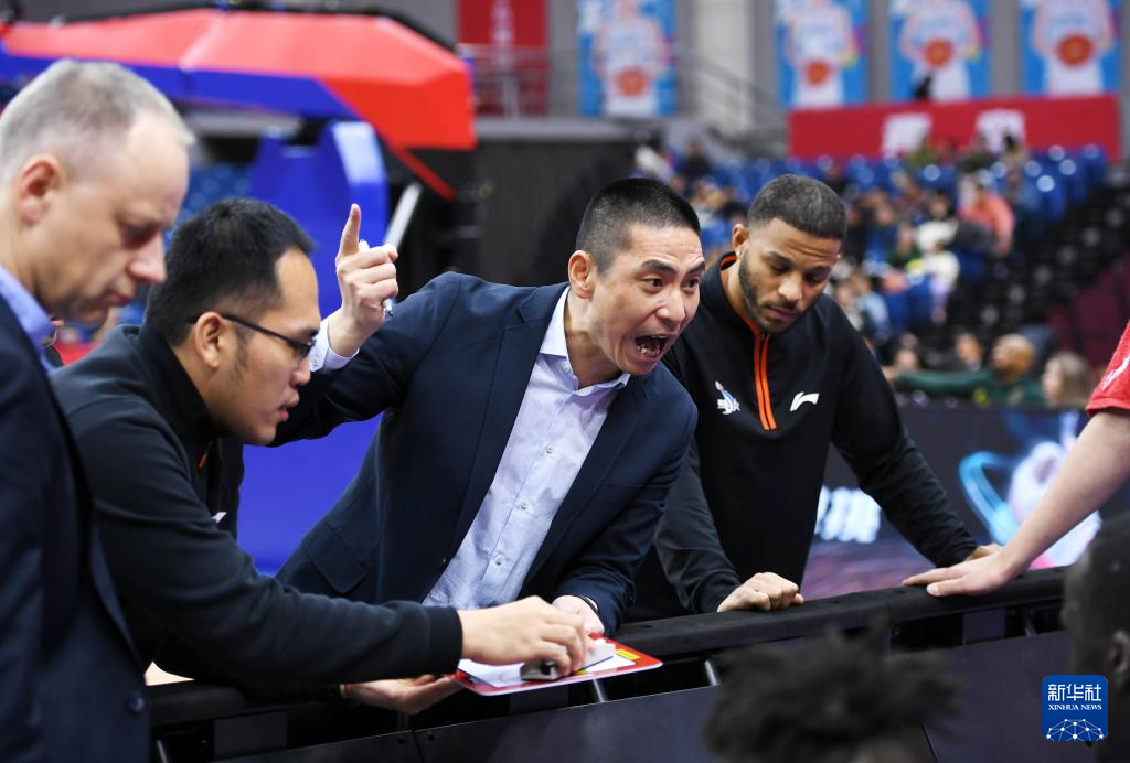 1月27日,青岛国信水产队主教练刘维伟(中)在比赛中布置战术。新华社记者 李紫恒 摄