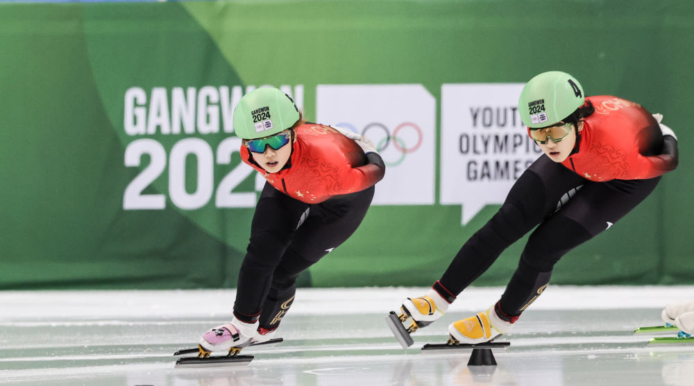1月20日,中国选手杨婧茹与李金恣(右)在短道速滑女子1500米决赛中。新华社记者 许雅楠 摄