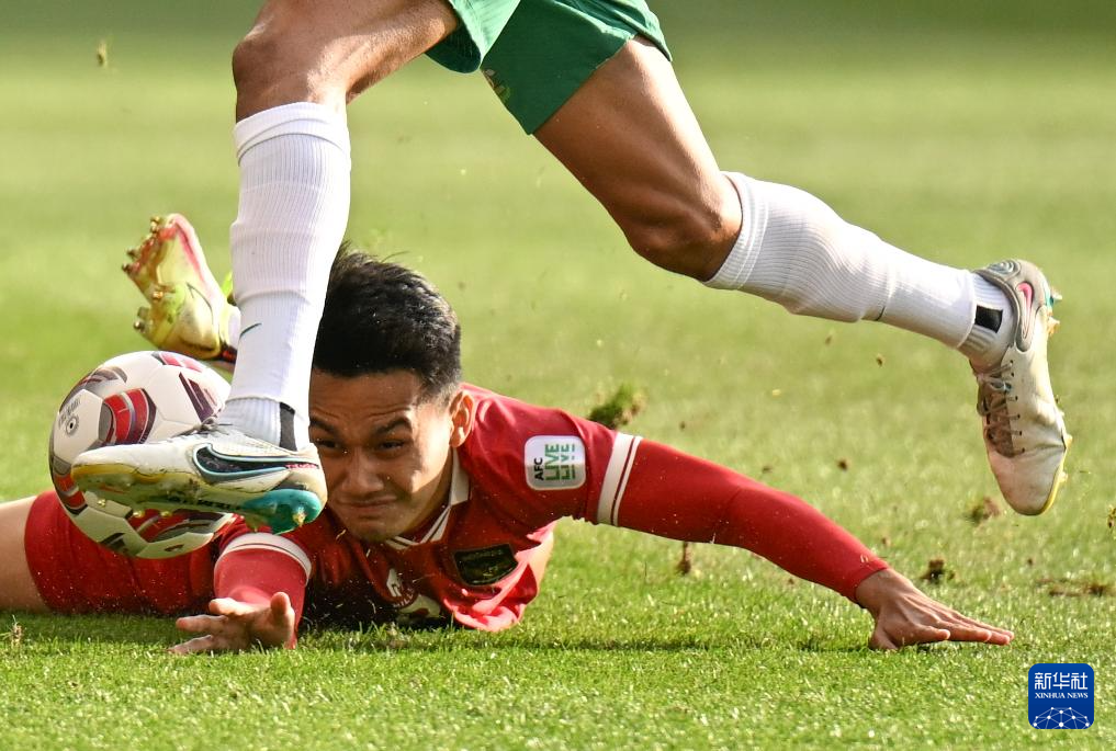 1月28日,印度尼西亚队球员阿斯维纳·巴哈尔(左)与澳大利亚队球员阿奇兹·贝希奇在比赛中拼抢。新华社记者 丁汀 摄