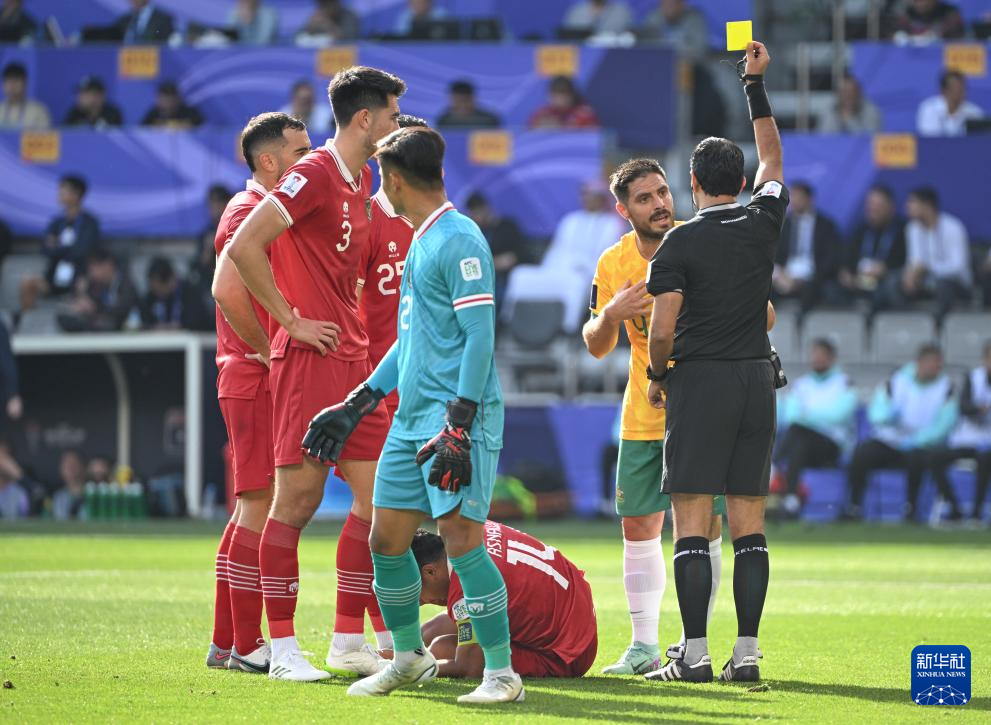 1月28日,主裁判哈桑向澳大利亚队球员布鲁诺·福尔纳罗利(右二)出示黄牌。新华社记者 孙凡越 摄