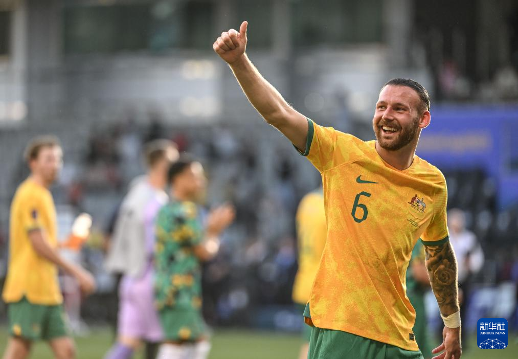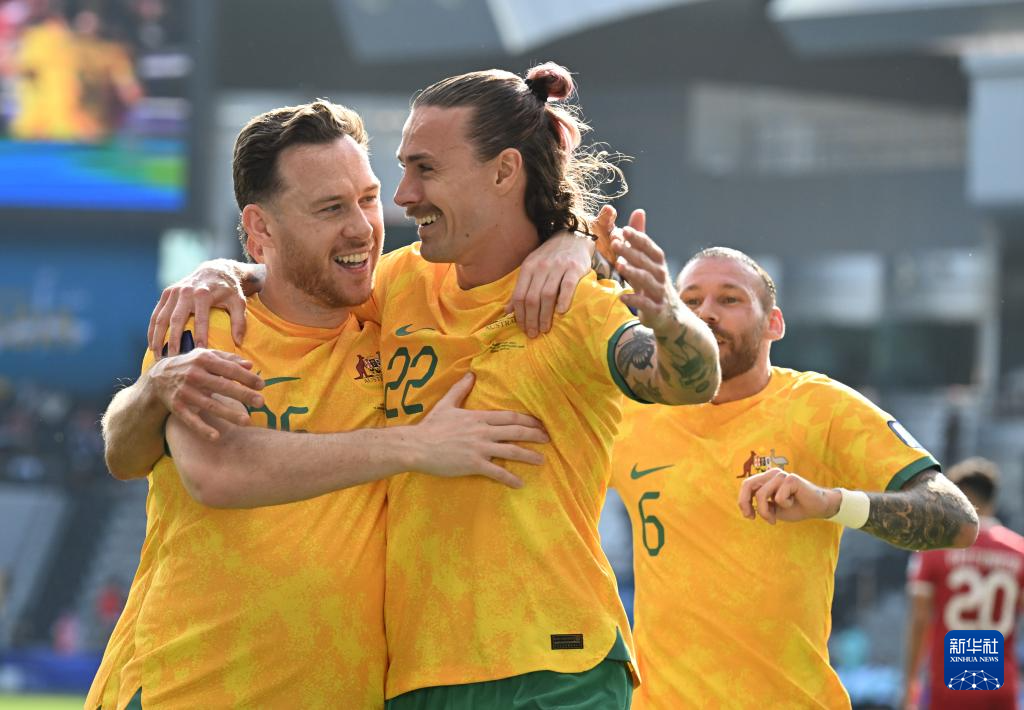 1月28日,澳大利亚队球员庆祝进球。新华社记者 孙凡越 摄
