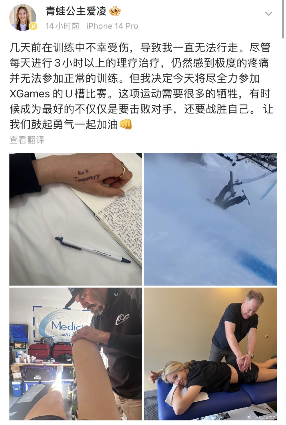 本场比赛开始前,谷爱凌在社交媒体上发文表示,此次她是带伤参赛。“几天前在训练中的不幸受伤,导致我一直无法行走……但我决定今天将尽全力参加X Games的U型场地技巧比赛。”