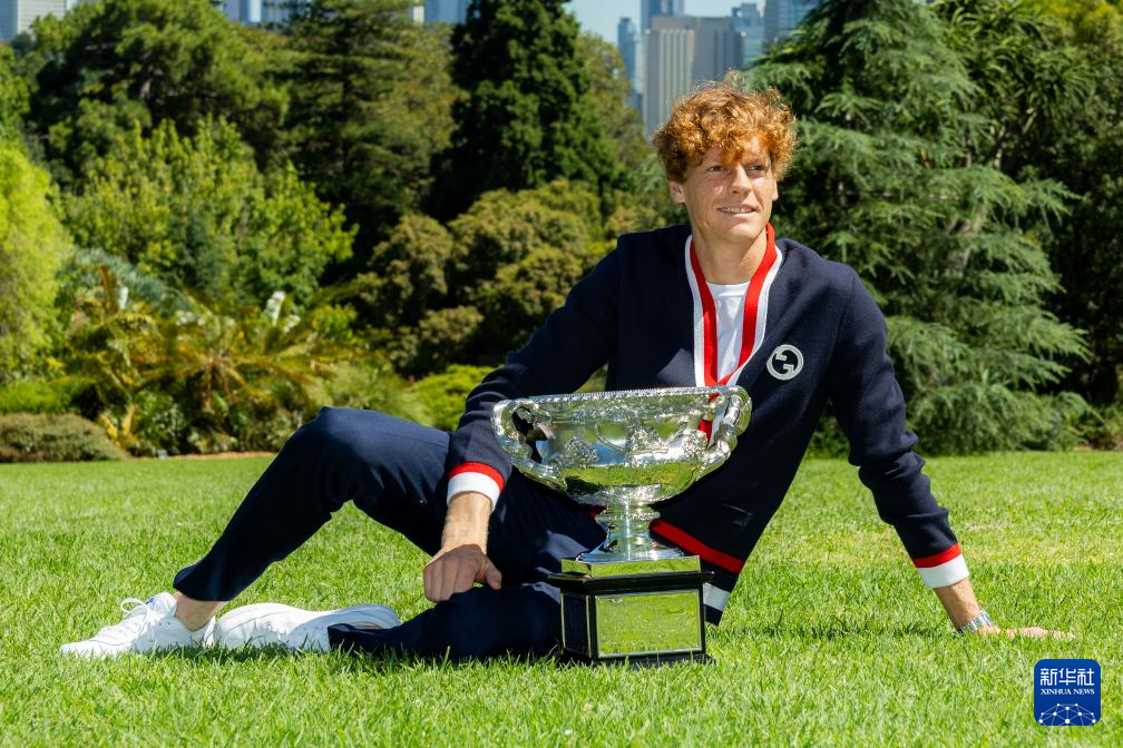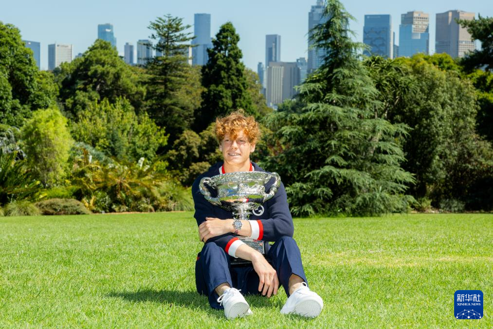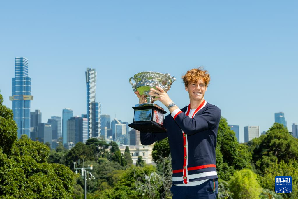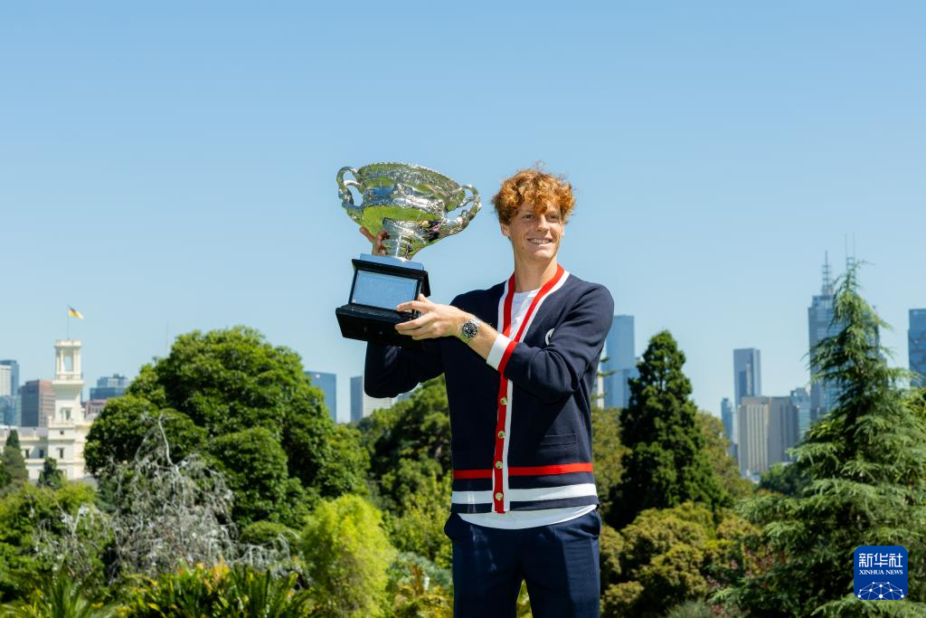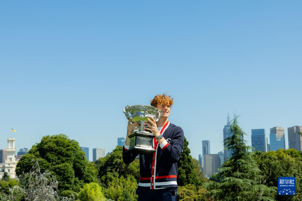 当日,2024年澳大利亚网球公开赛男子单打冠军、意大利选手辛纳在墨尔本皇家植物园展示冠军奖杯。