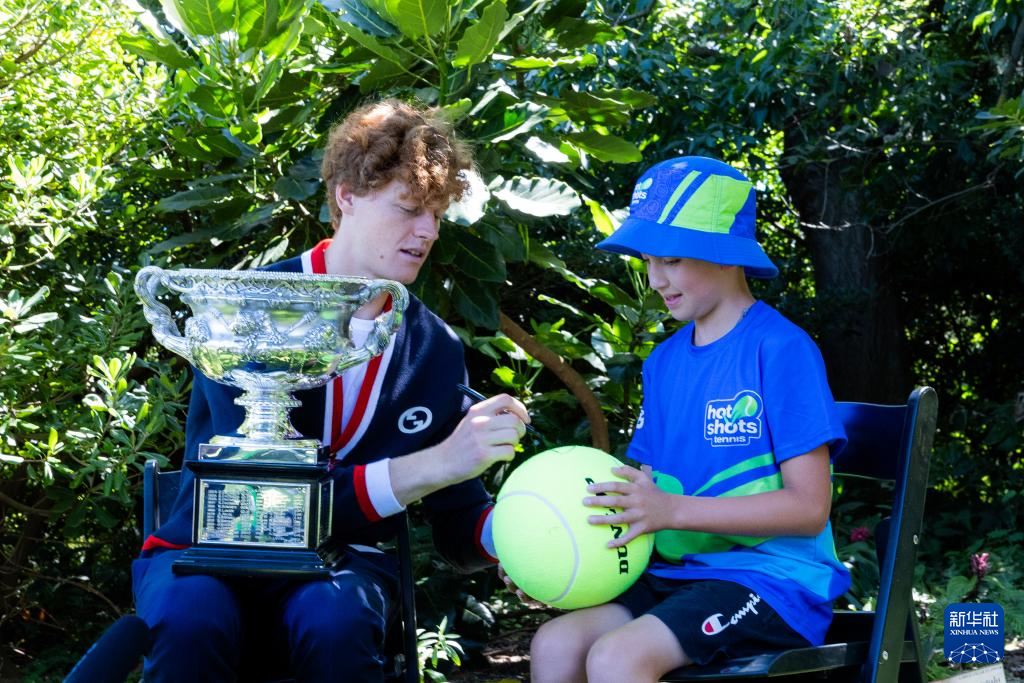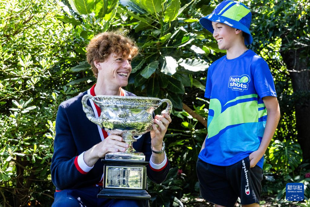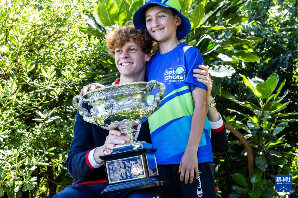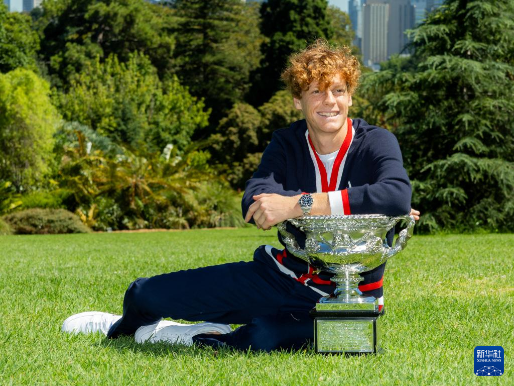 当日,2024年澳大利亚网球公开赛男子单打冠军、意大利选手辛纳在墨尔本皇家植物园展示冠军奖杯。