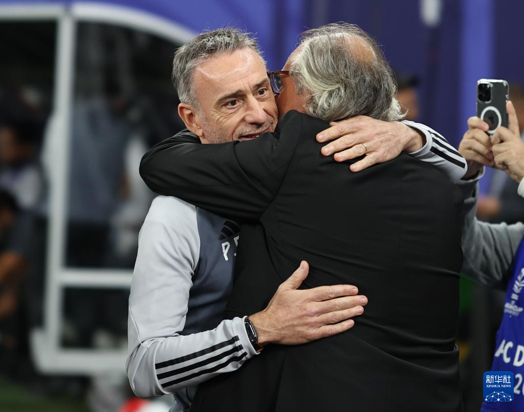 1月28日,阿联酋队主教练保罗·本托(左)与塔吉克斯坦队主教练佩塔尔·舍格尔特在比赛前相互致意。新华社记者 贾浩成 摄