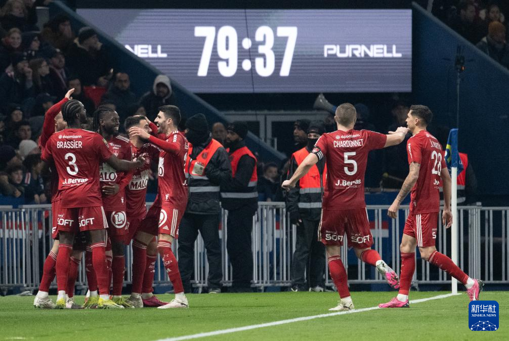 1月28日,布雷斯特队球员庆祝进球。新华社发(杰克·陈摄)