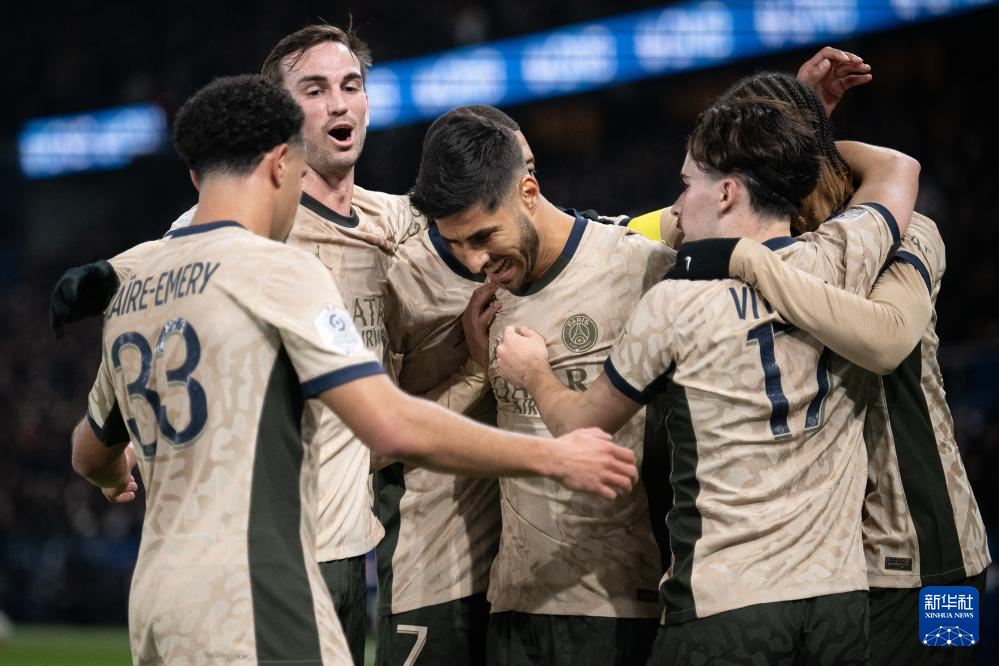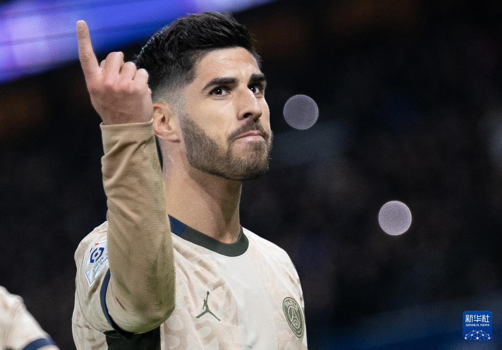 1月28日,巴黎圣日耳曼队球员阿森西奥庆祝进球。新华社发(杰克·陈摄)