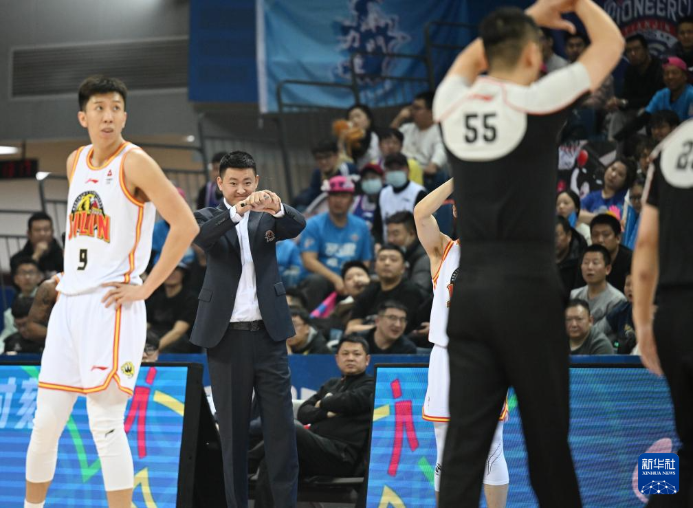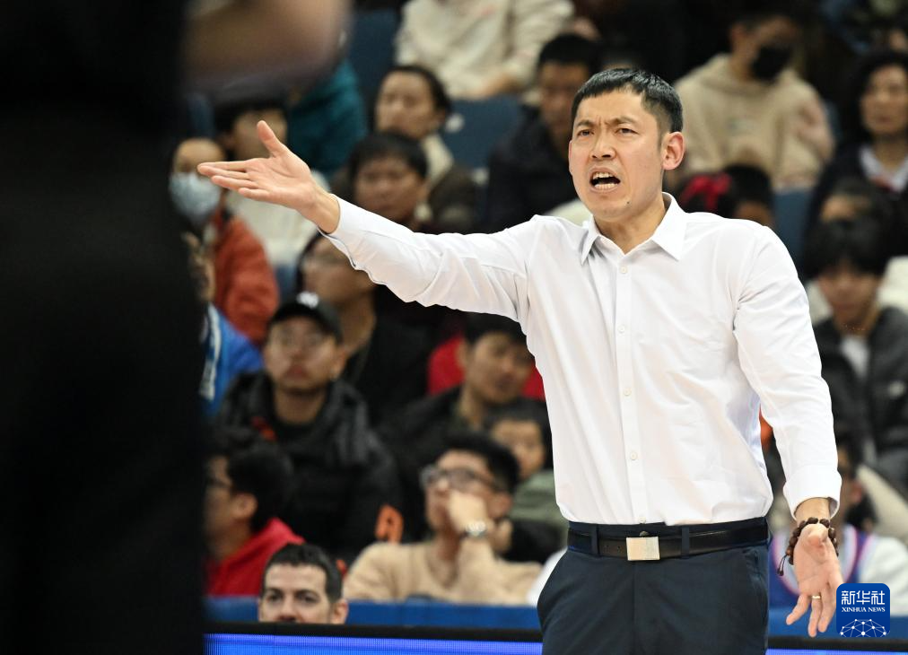 1月28日,吉林九台农商银行队主教练高俊超(左二)在场边指挥。新华社记者 赵子硕 摄