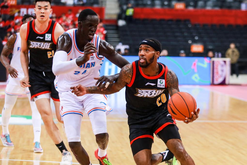 1月29日,深圳马可波罗队球员亚当斯(右)在比赛中进攻。新华社发(彭志刚摄)