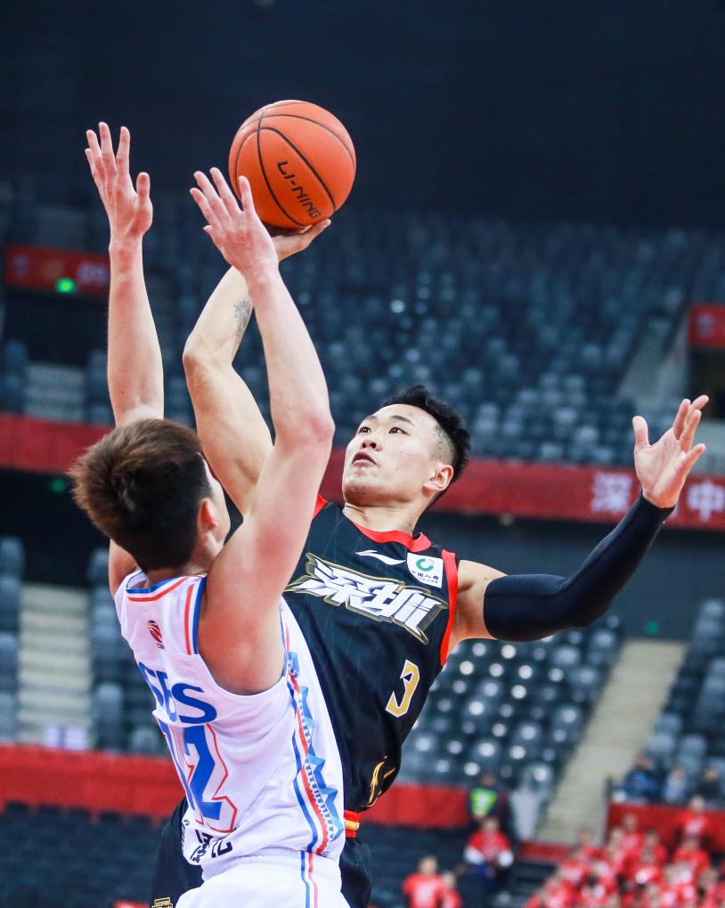 1月29日,深圳马可波罗队球员沈梓捷(上)在比赛中上篮。新华社发(彭志刚摄)