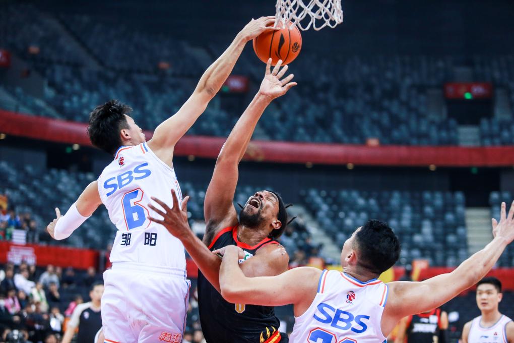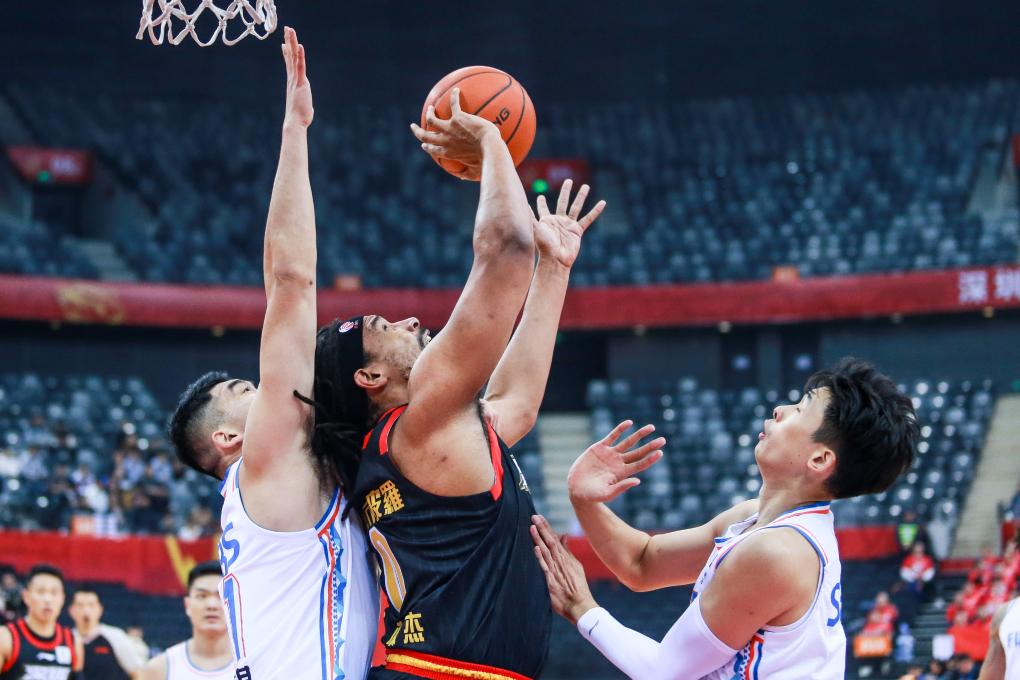 1月29日,深圳马可波罗队球员萨林杰(中)在比赛中进攻受阻。新华社发(彭志刚摄)