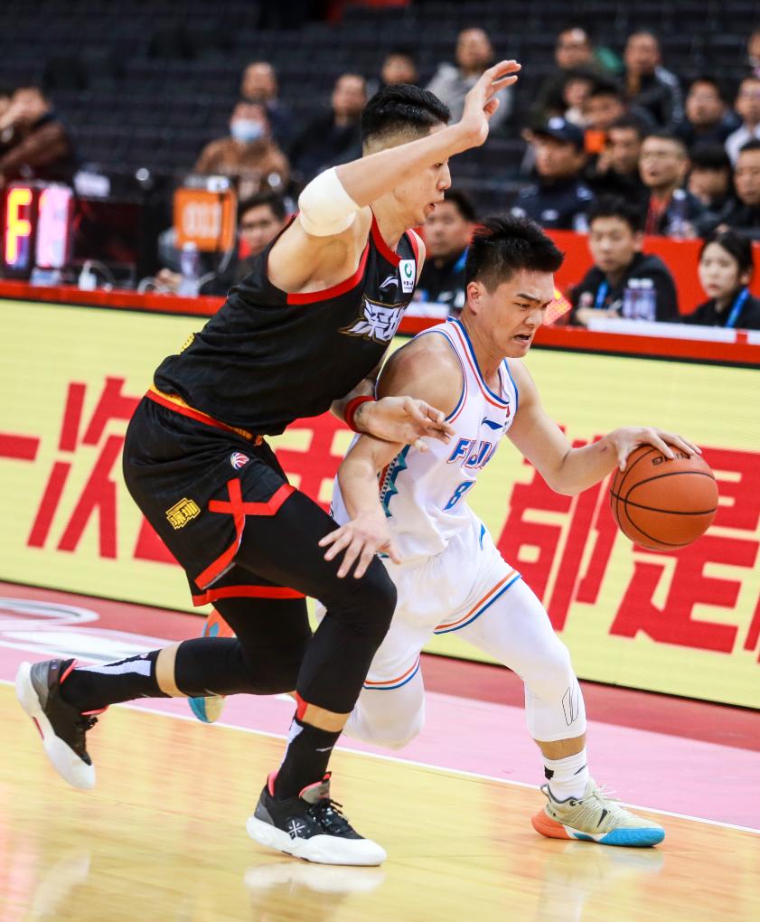 1月29日,福建浔兴股份队球员黎伊扬(右)在比赛中带球突破。新华社发(彭志刚摄)