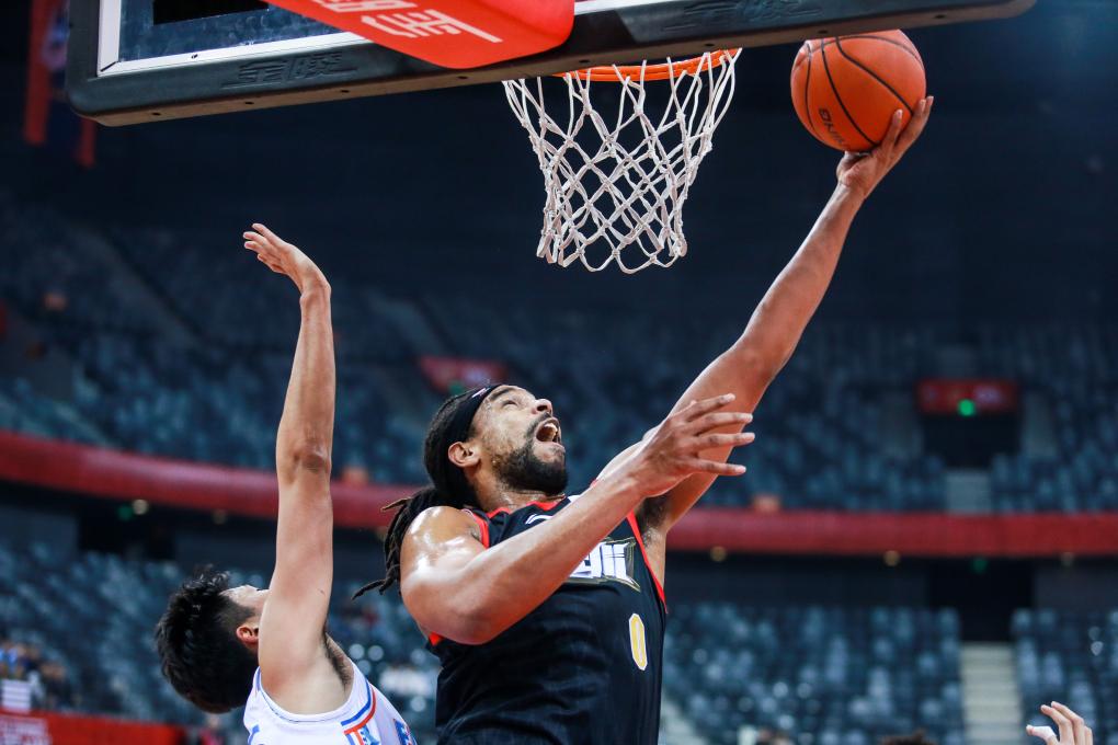 1月29日,深圳马可波罗队球员萨林杰(右)在比赛中上篮。新华社发(彭志刚摄)