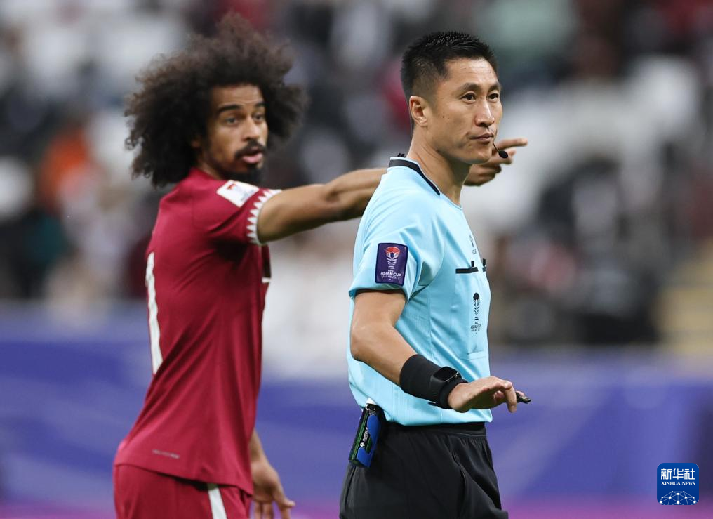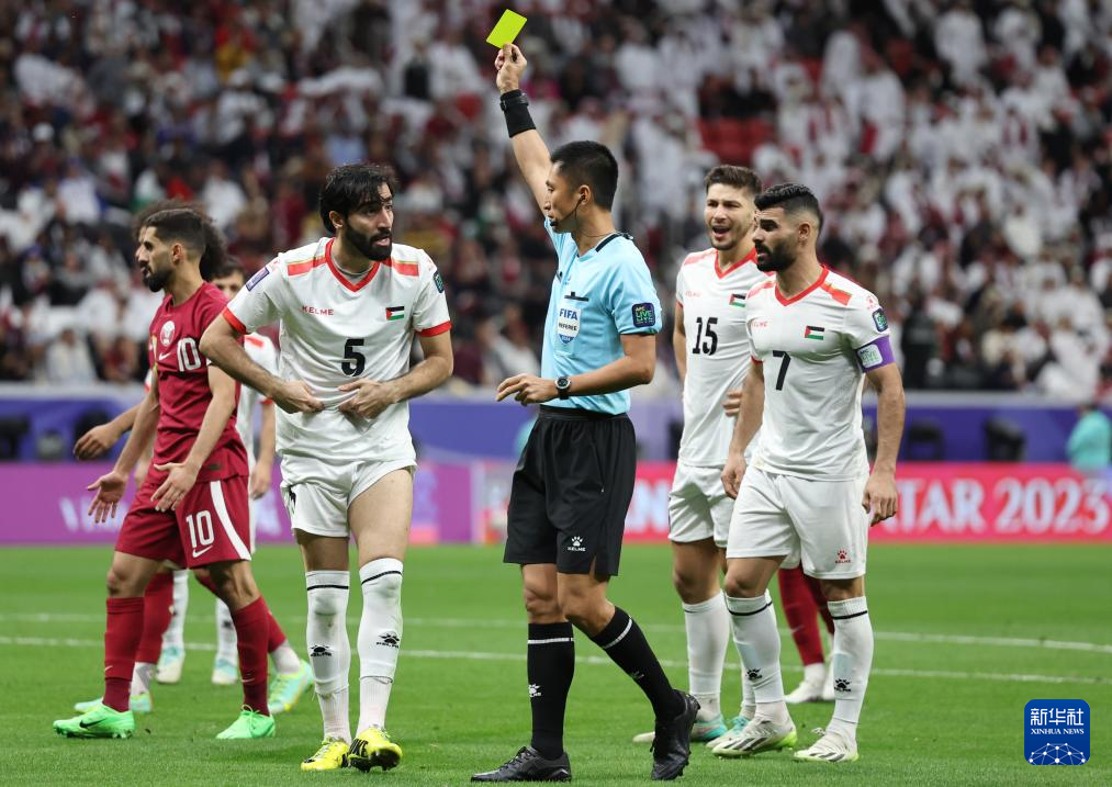 1月29日,巴勒斯坦队球员穆罕默德·萨利赫(左二)在禁区内对卡塔尔队球员阿尔穆兹·阿里犯规后,被主裁判马宁(中)出示黄牌。新华社记者 贾浩成 摄