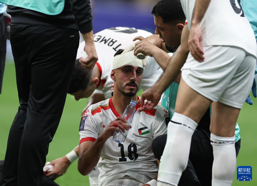 1月29日,巴勒斯坦队球员穆哈那头部受伤后接受治疗。新华社记者 贾浩成 摄