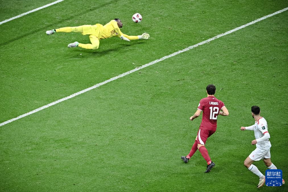 1月29日,卡塔尔队守门员迈沙阿勒·巴沙姆(上)未能扑出巴勒斯坦队球员奥代·达巴格(下右)的射门。新华社记者 江汉 摄