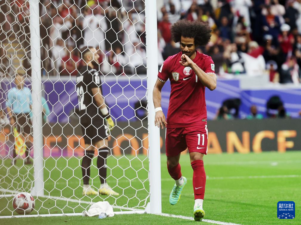 1月29日,卡塔尔队球员阿克拉姆·阿菲夫主罚点球得分后庆祝。新华社记者 贾浩成 摄