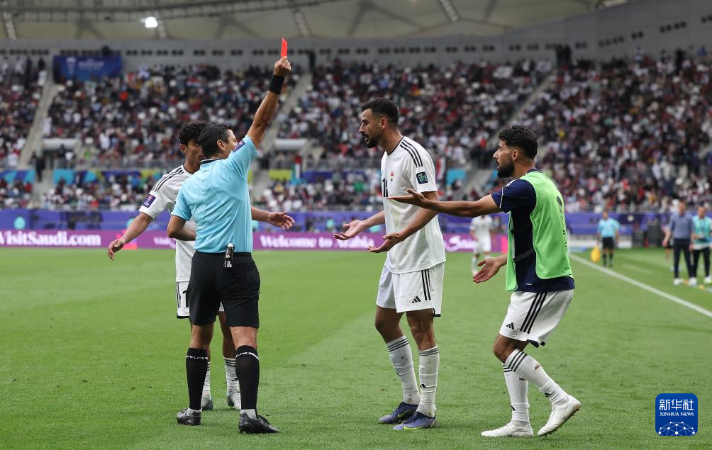 1月29日,伊拉克队球员艾曼·侯赛因(右二)在比赛中被红牌罚下。新华社记者 曹灿 摄