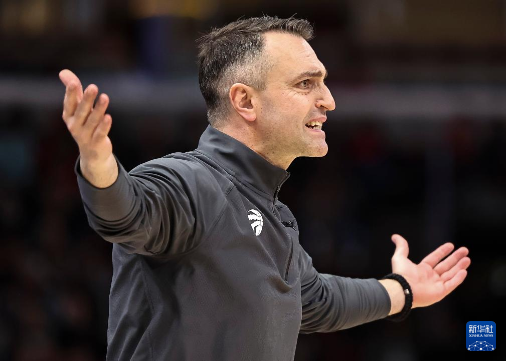 1月30日,猛龙队教练拉贾科维奇在比赛中质疑裁判。新华社发(乔尔·莱纳摄)