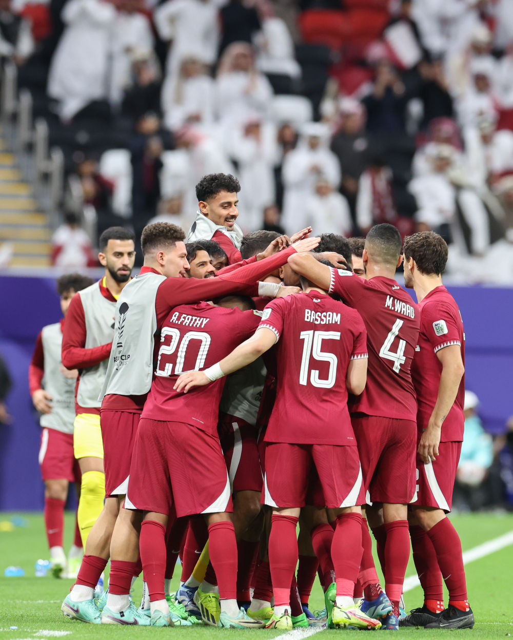 1月29日,卡塔尔队球员在比赛中庆祝进球。新华社记者 丁汀 摄