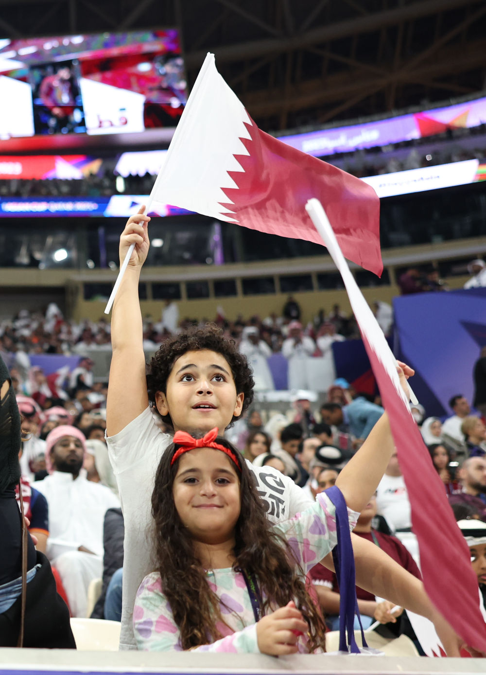 1月12日,卡塔尔小球迷在看台观看男足亚洲杯开幕式。新华社记者 贾浩成 摄