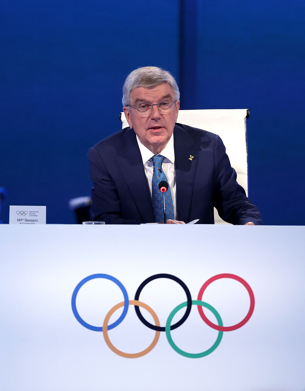 2023年10月15日,国际奥委会主席巴赫在国际奥委会第141次全会上发言。新华社记者 曹灿 摄