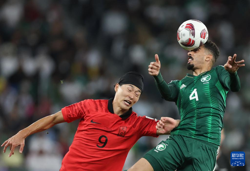 1月30日,沙特阿拉伯队球员萨勒姆·达瓦萨里(左)与韩国队球员金玟哉在比赛中拼抢。新华社记者 曹灿 摄
