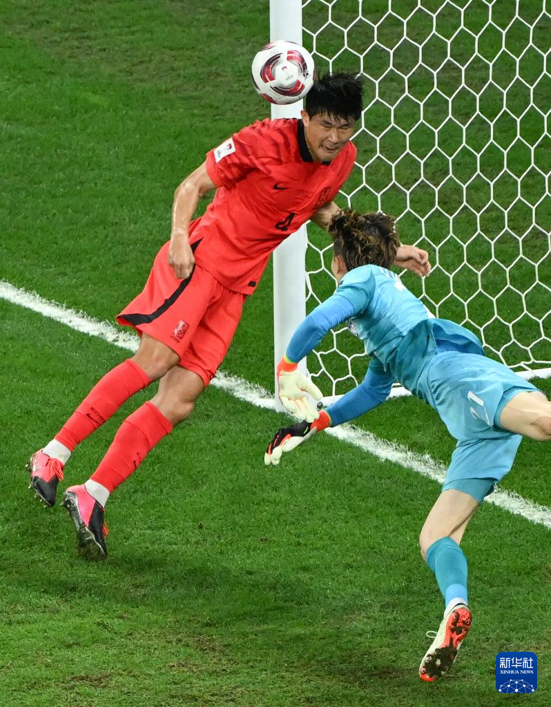 1月30日,韩国队球员曹圭成(左一)在比赛中头球攻门,打入绝平进球。新华社记者 贾浩成 摄