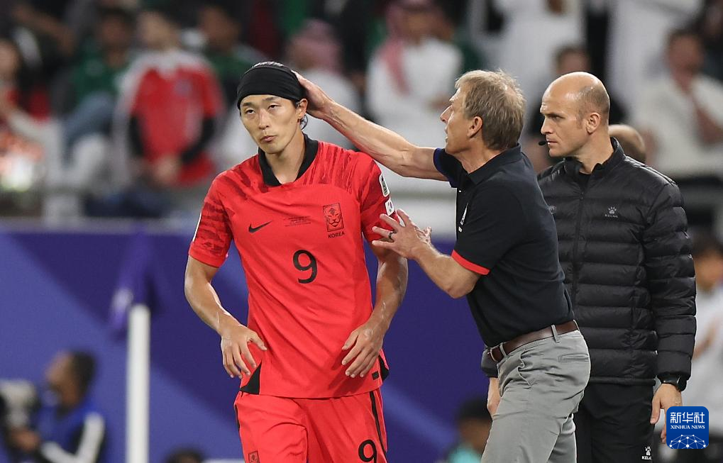 1月30日,韩国队主教练尤尔根·克林斯曼(中)在比赛中鼓励打入扳平进球的韩国队球员曹圭成。新华社记者 曹灿 摄