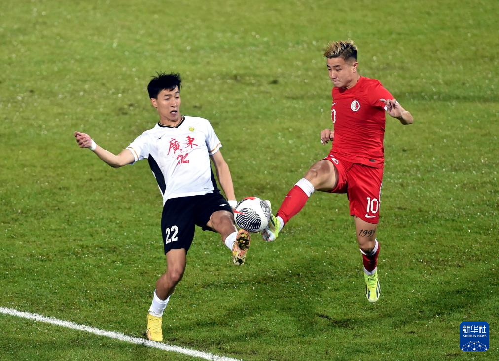 1月31日,香港队球员林乐勤(右)与广东队球员李宁拼抢。新华社记者 卢炳辉 摄