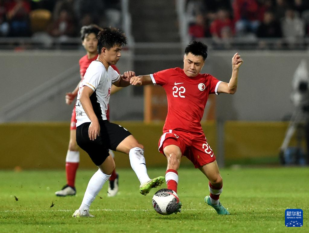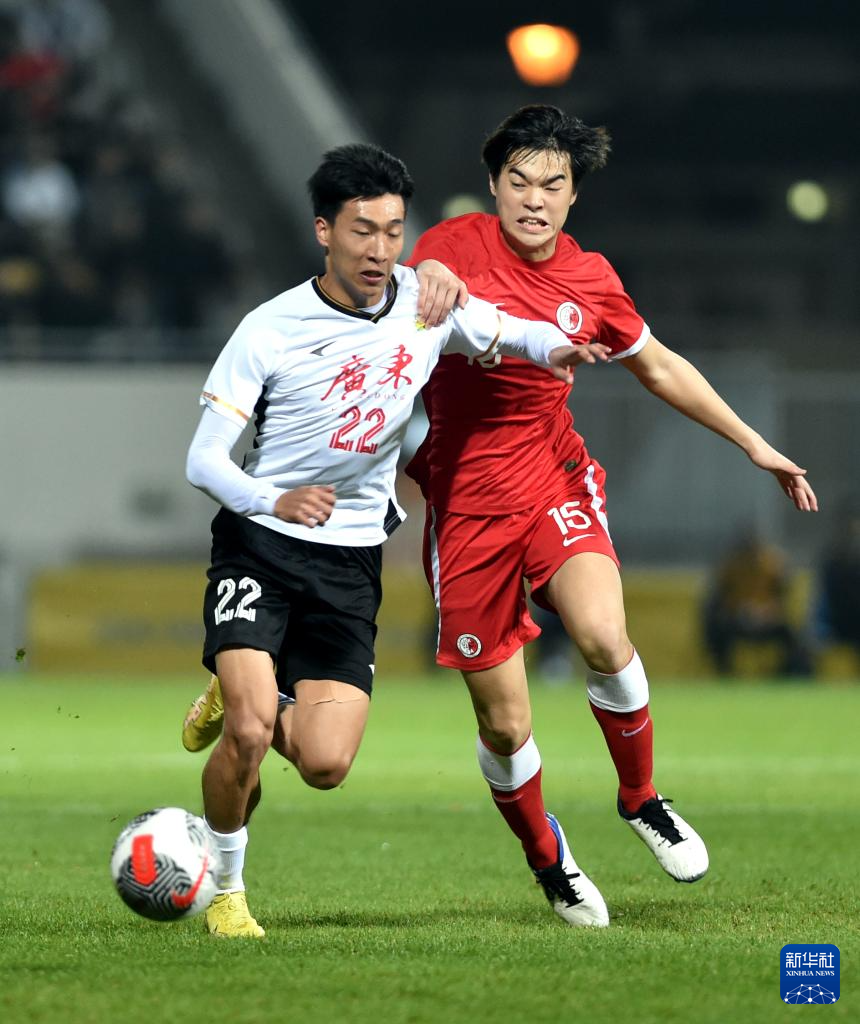 1月31日,香港队球员孙铭谦(右)与广东队球员田子羿拼抢。新华社记者 卢炳辉 摄