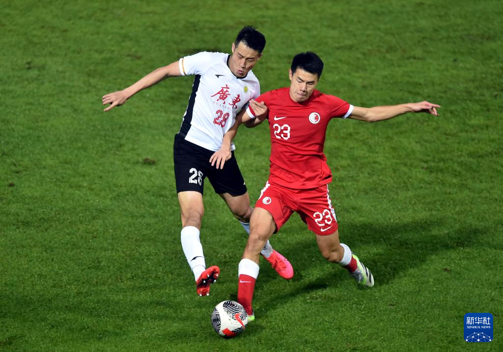 1月31日,香港队球员曾以行(左)与广东队球员肖智拼抢。新华社记者 卢炳辉 摄