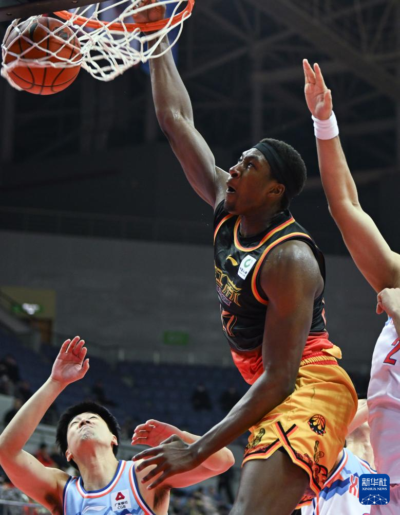 1月31日,江苏肯帝亚队球员卡巴(上)在比赛中扣篮。新华社发(王须中摄)
