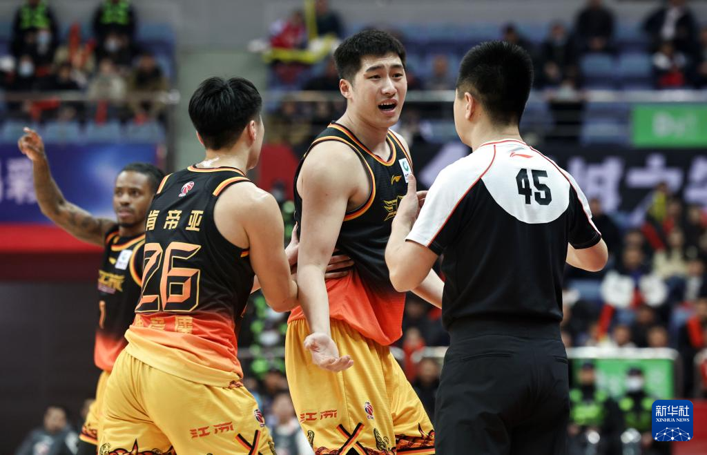 1月31日,新疆伊力特队球员阿不都沙拉木(左)质疑裁判判罚。新华社发(徐培钦摄)
