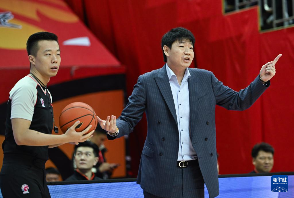 1月31日,新疆伊力特队主教练邱彪(右)在场边指挥。新华社发(王须中摄)