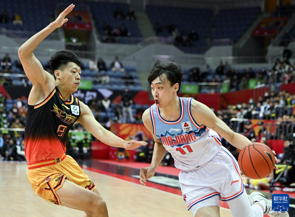 1月31日,新疆伊力特队球员阿不都沙拉木(右)在比赛中带球突破。新华社发(徐培钦摄)