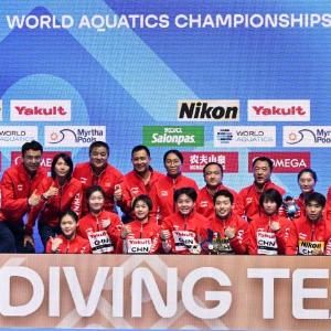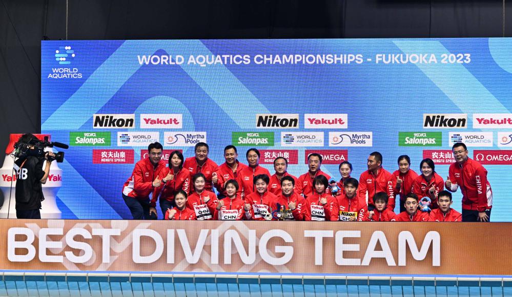 资料图:2023年福冈游泳世锦赛,中国跳水队获得“最佳跳水队”称号。新华社记者 张笑宇 摄