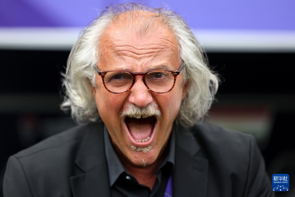 2月2日,塔吉克斯坦队主教练佩塔尔·舍格尔特在比赛前为队员加油。新华社记者 曹灿 摄