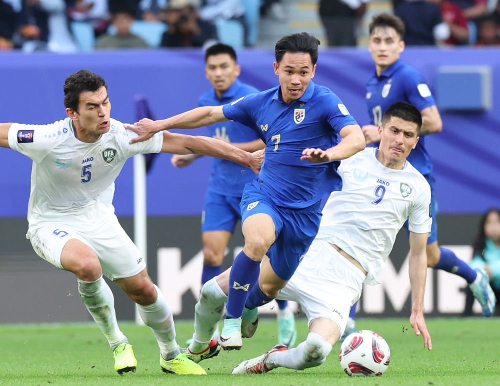 1月30日,泰国队球员与乌兹别克斯坦队球员在比赛中拼抢。新华社记者 丁汀 摄