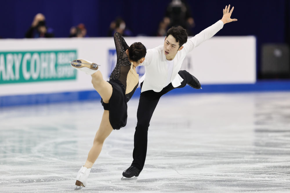 2月3日,中国组合彭程/王磊(右)在自由滑比赛中。新华社记者 王翔 摄