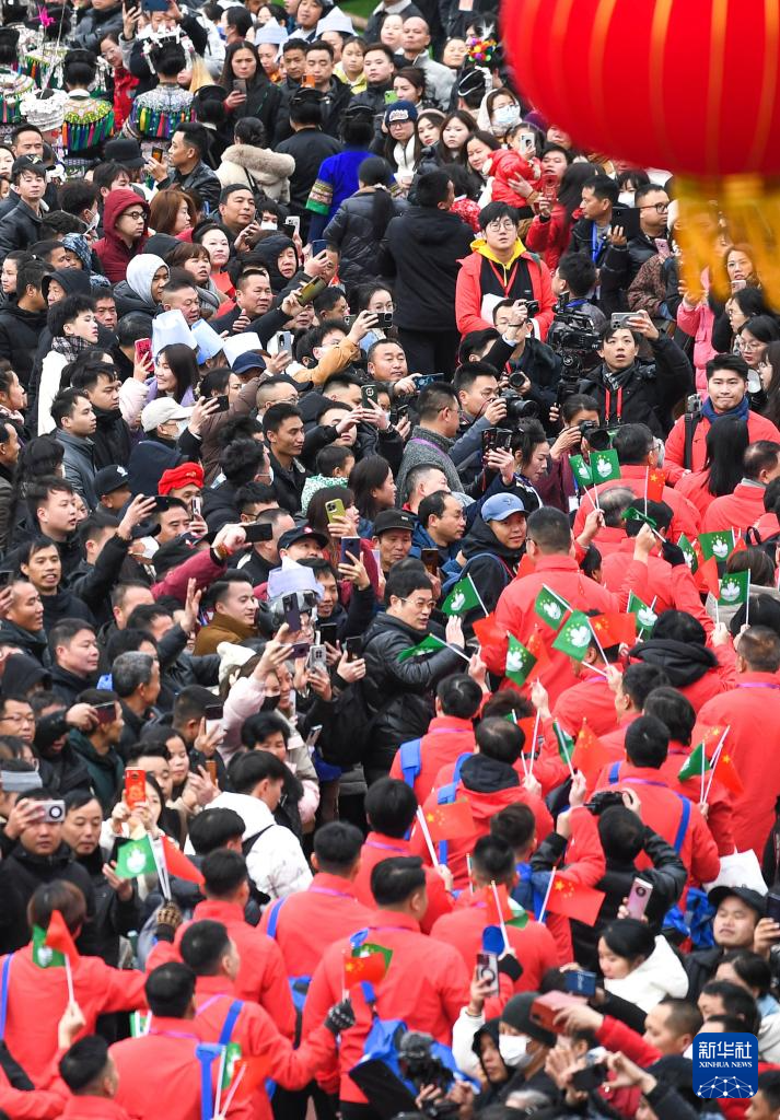 2月3日,人们在“村超村晚”文艺晚会现场与吉祥物互动。新华社记者 杨文斌 摄
