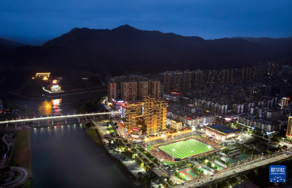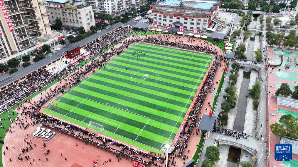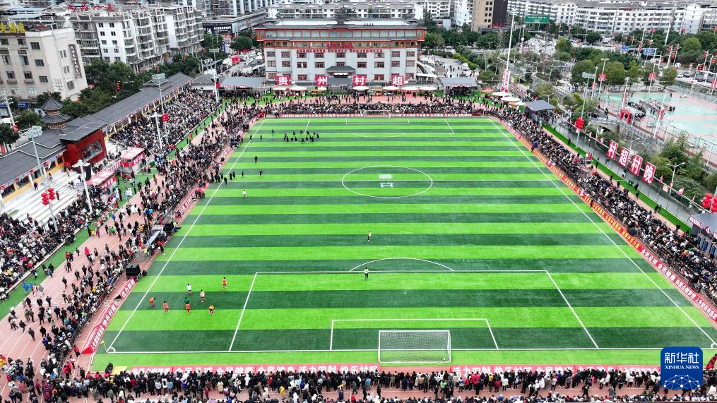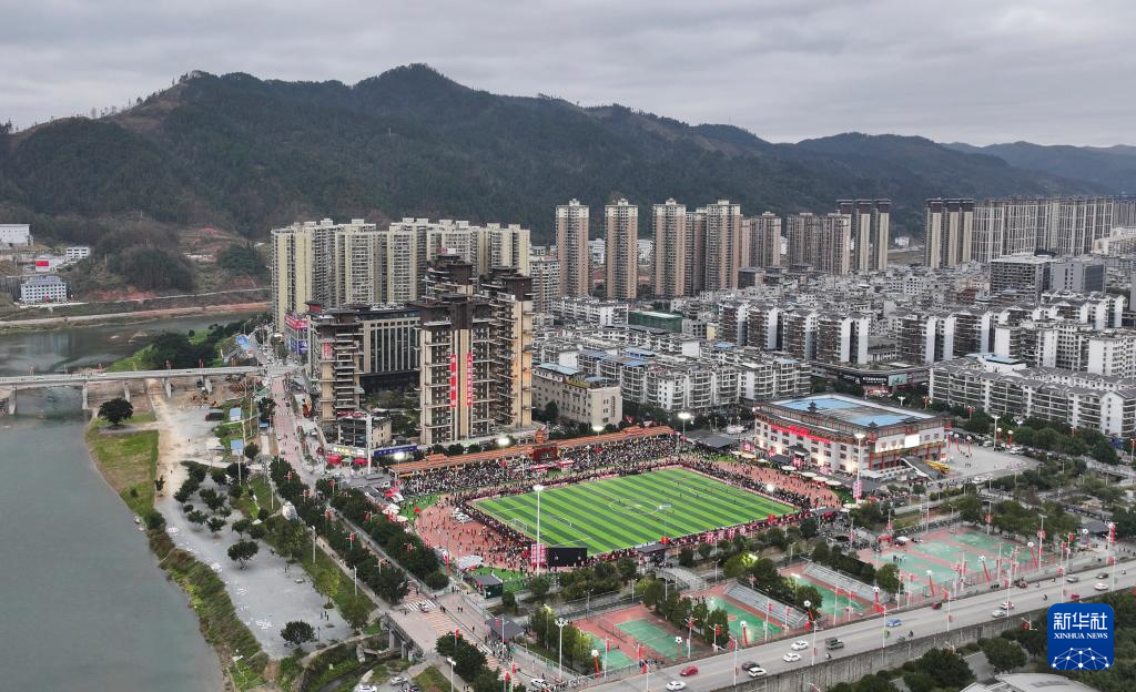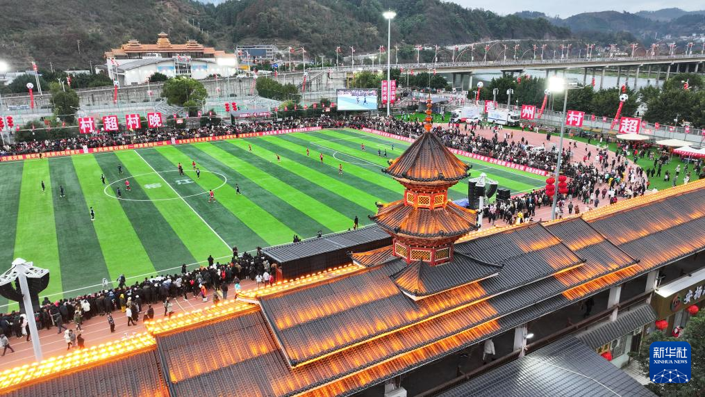 2月3日,贵州村超联队与澳门职工联队在比赛中(无人机照片)。新华社记者 刘续 摄