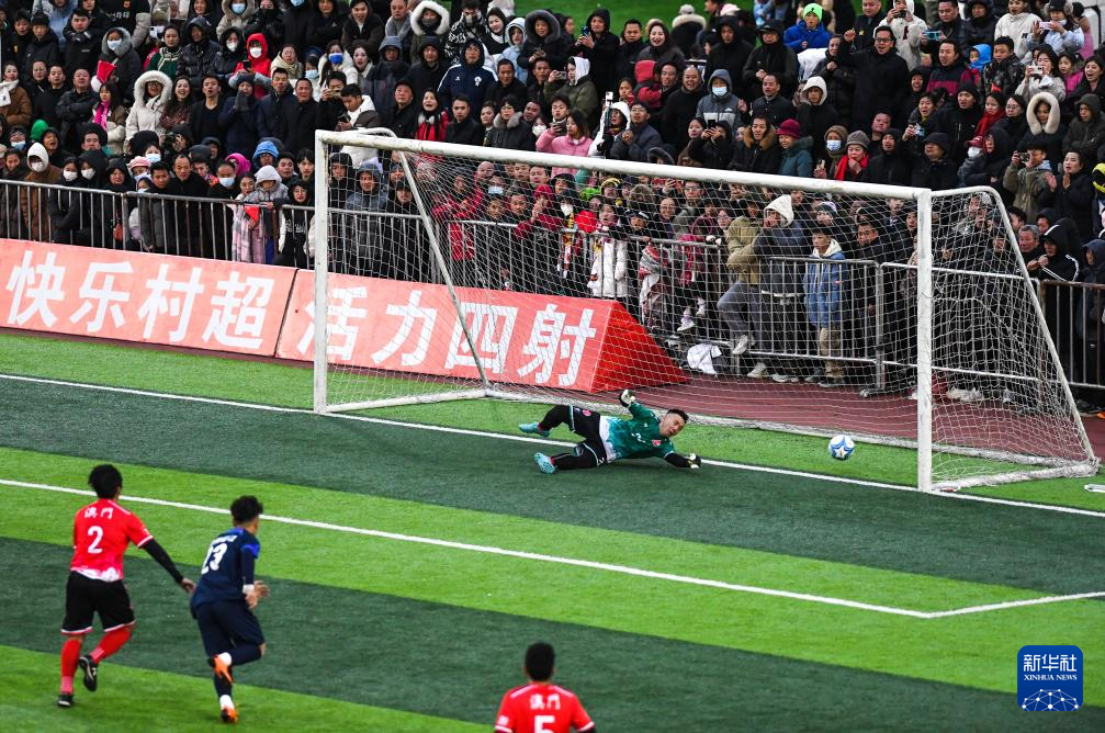2月3日,澳门职工联队守门员刘美伟未能扑出贵州村超联队球员主罚的点球。新华社记者 杨文斌 摄