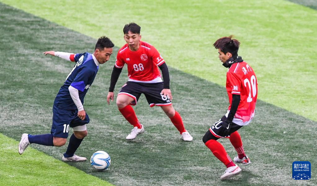 2月3日,贵州村超联队球员董永恒(左)与澳门职工联队球员吴嘉华(中)、何子枫拼抢。新华社记者 杨文斌 摄