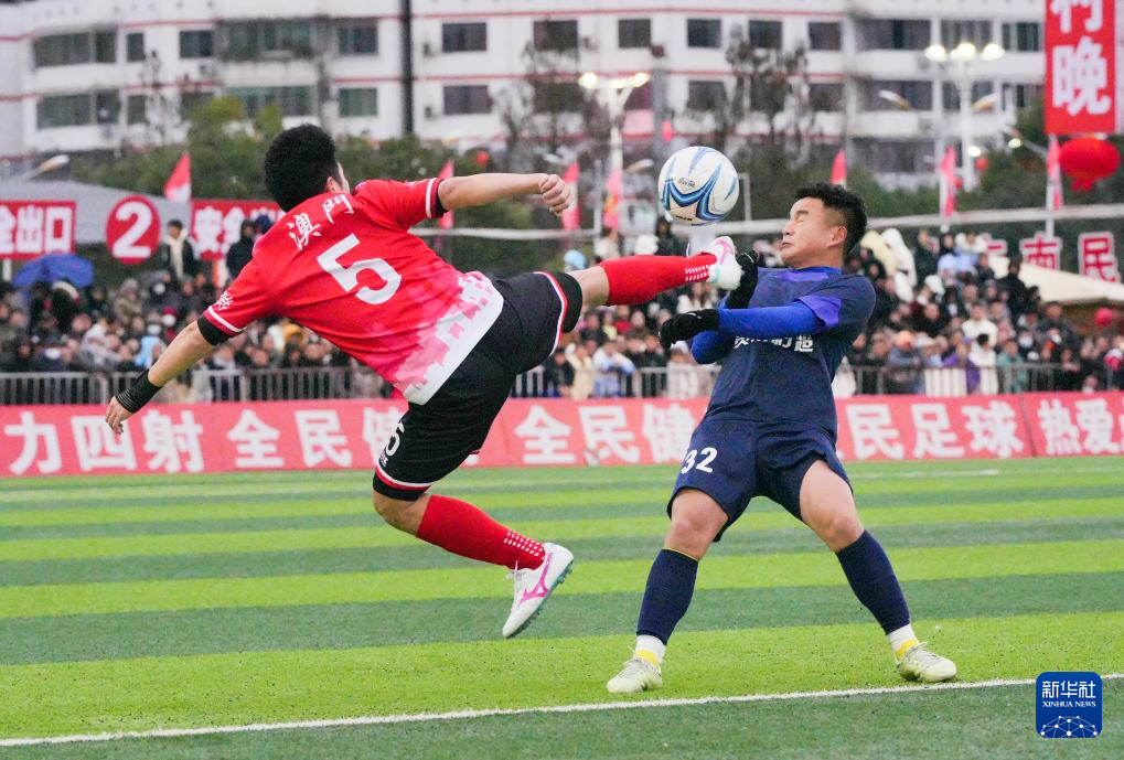 2月3日,澳门职工联队球员刘志恒(左)与贵州村超联队球员张家铭拼抢。新华社发(龙建睿摄)