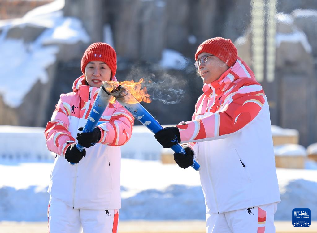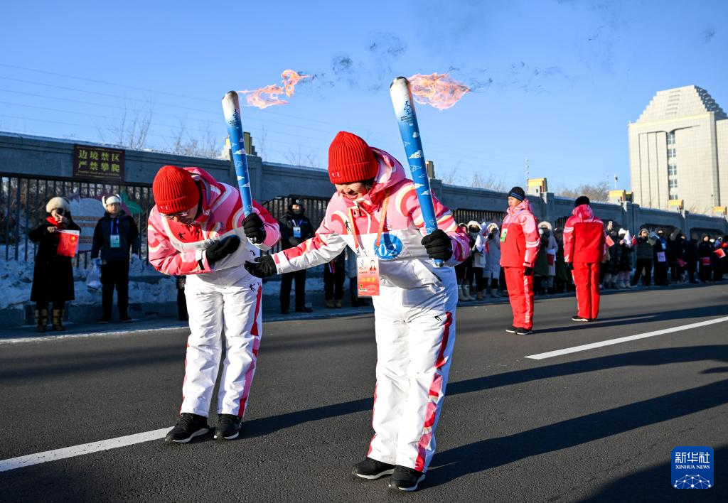 2月3日,在内蒙古呼伦贝尔市满洲里国门景区,火炬手包玲玲(右)和钱卓在火炬传递活动中。新华社记者 连振 摄