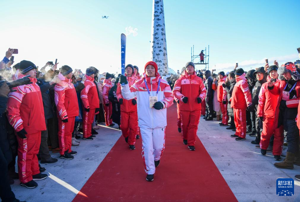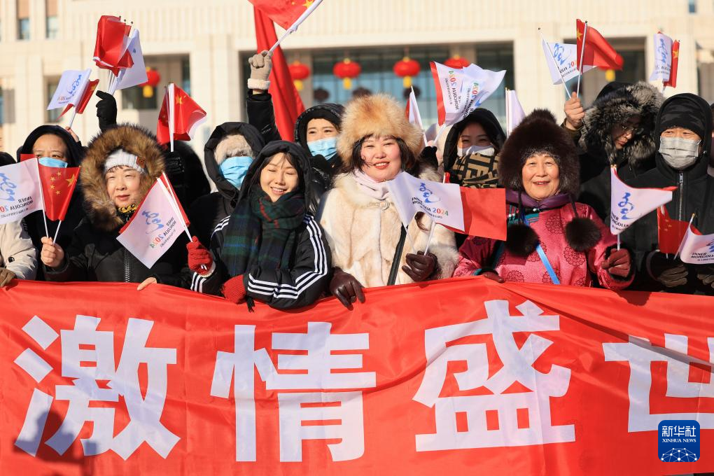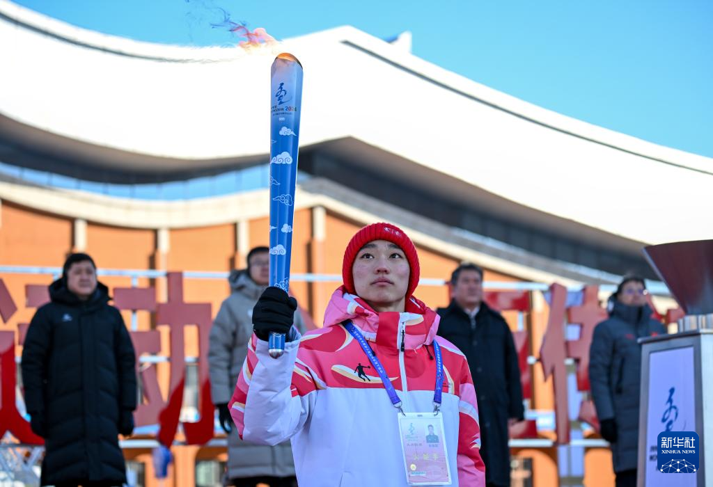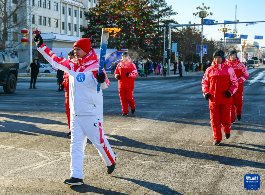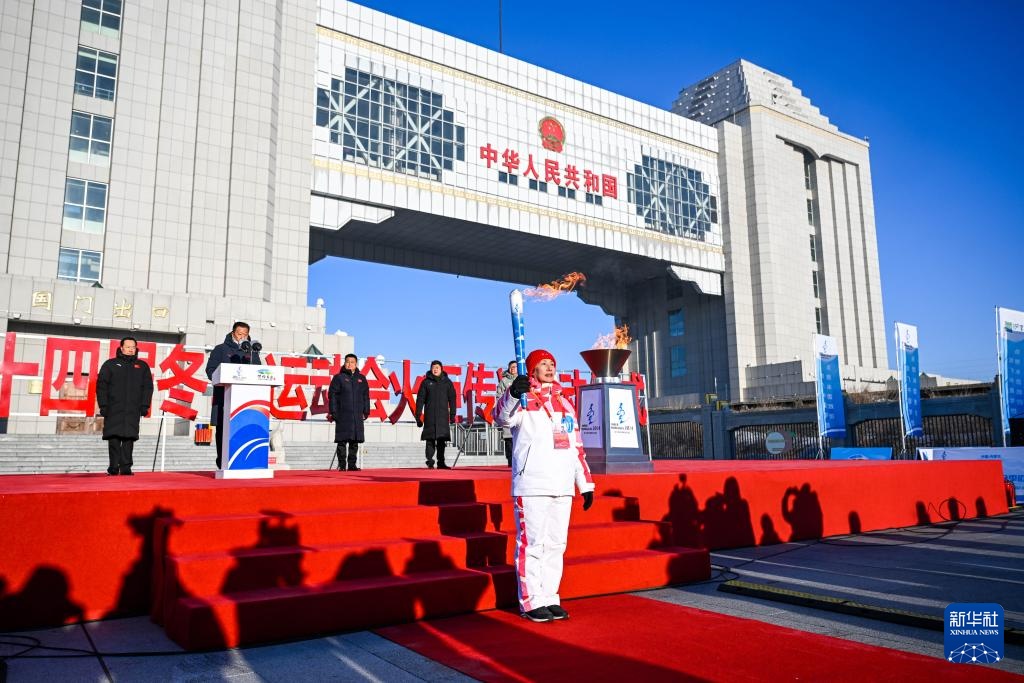 2月3日,在内蒙古呼伦贝尔市满洲里国门景区,火炬手钱卓在火炬传递活动中。新华社记者 连振 摄