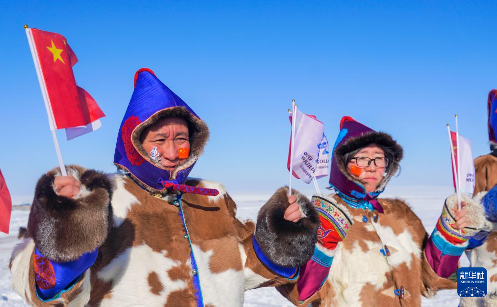 2月3日,火炬手孟和吉干(左)和米吉格道尔吉在火炬传递活动中。新华社发(西日呼摄)