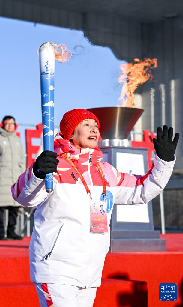 2月3日,在内蒙古呼伦贝尔市满洲里国门景区,第一棒火炬手王桂芳在火炬传递活动中。新华社记者 连振 摄