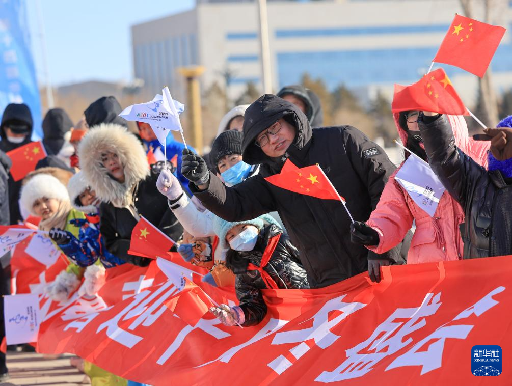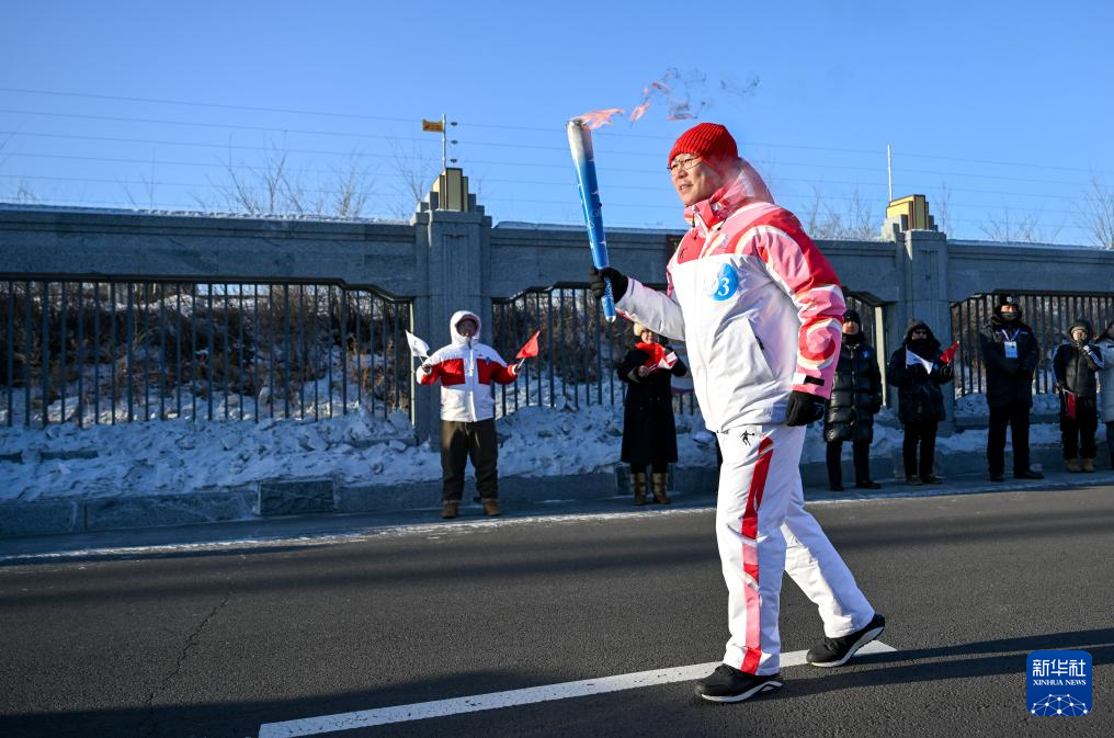 2月3日,火炬手宋桂旭在火炬传递活动中。新华社发(康文魁摄)